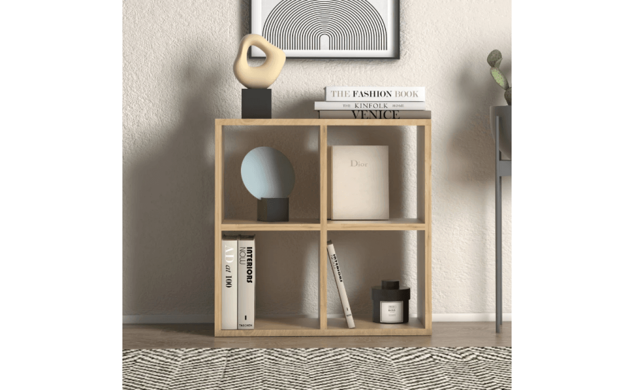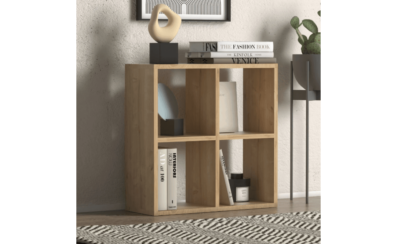 Een stevige en simpele maar multifunctioneel te gebruiken houten kast met 4 open vakken voor het opbergen en tonen van bijvoorbeeld verzamelingen of boeken maar ook andere woonaccessoires items.