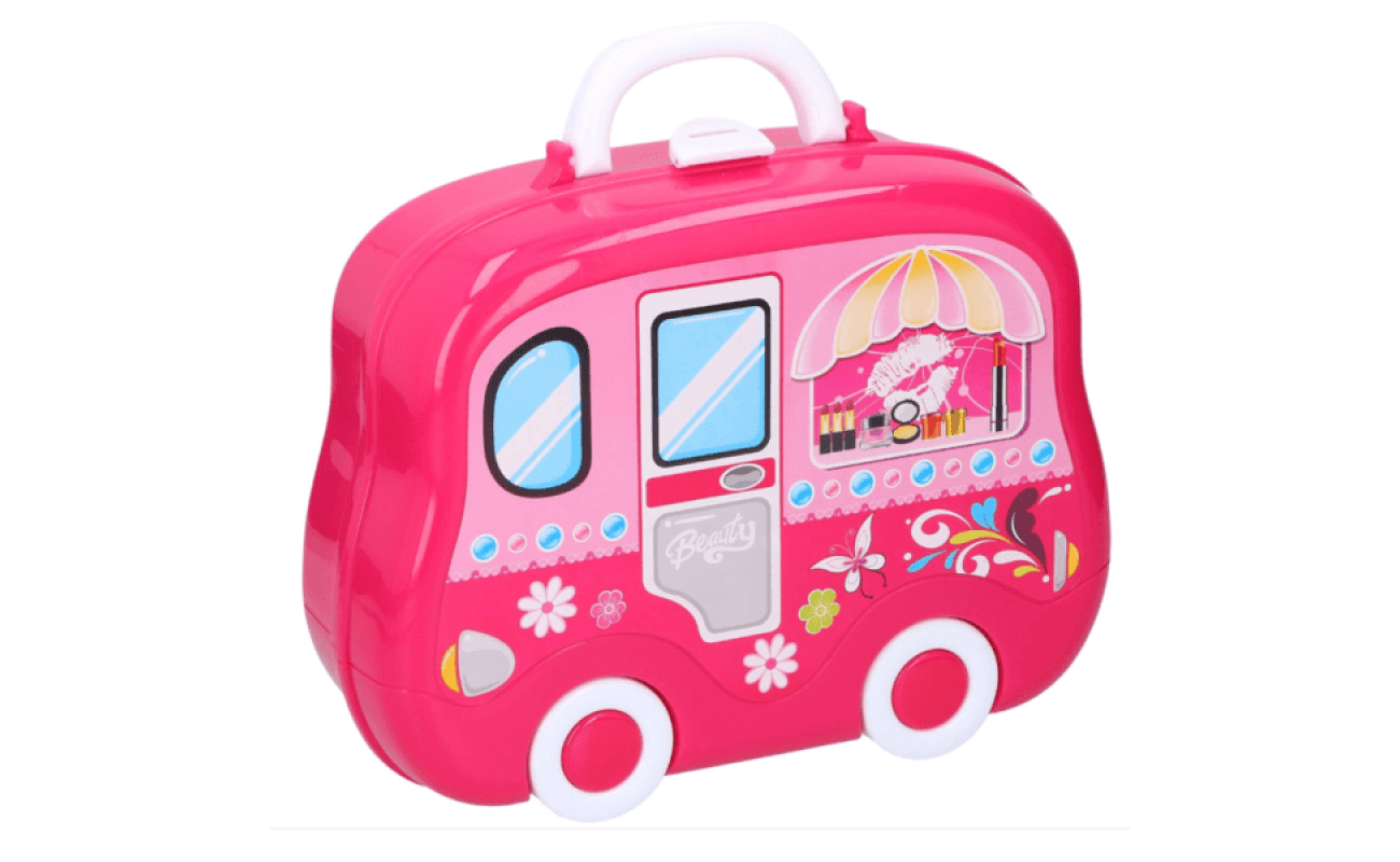 In deze set vind je 14 accessoires: verschillende sieraden en diverse haar- en 'make-upartikelen'.Ingeklapt heeft de koffer het uiterlijk van een vrolijke caravan.