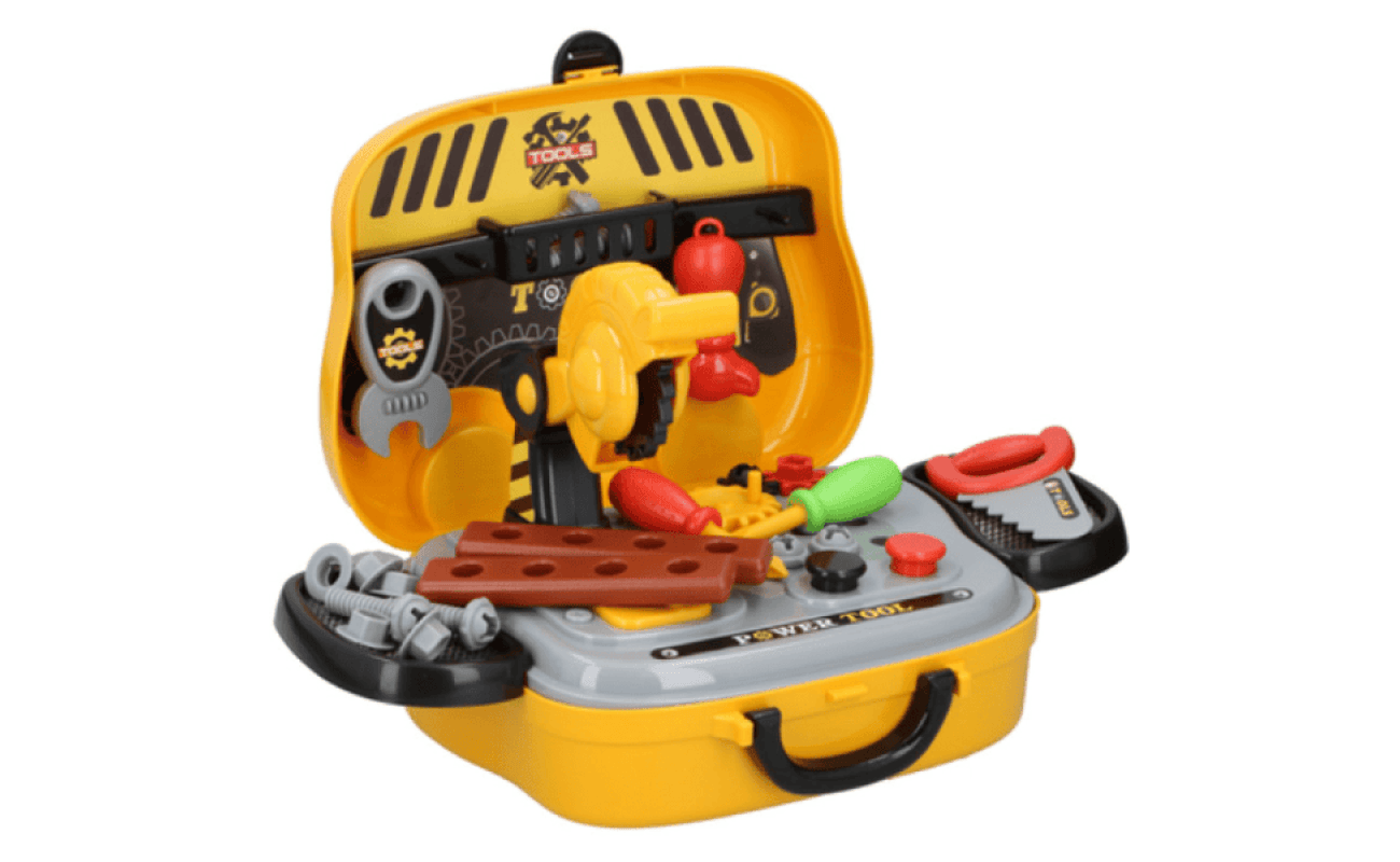 De koffer bevat diverse gereedschappen, zoals een tang, hamer, cirkelzaag en verschillende accessoires.