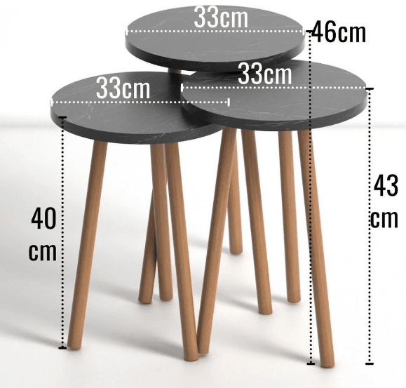 - Hoogte tafels: 40cm x 43cm x 46cm